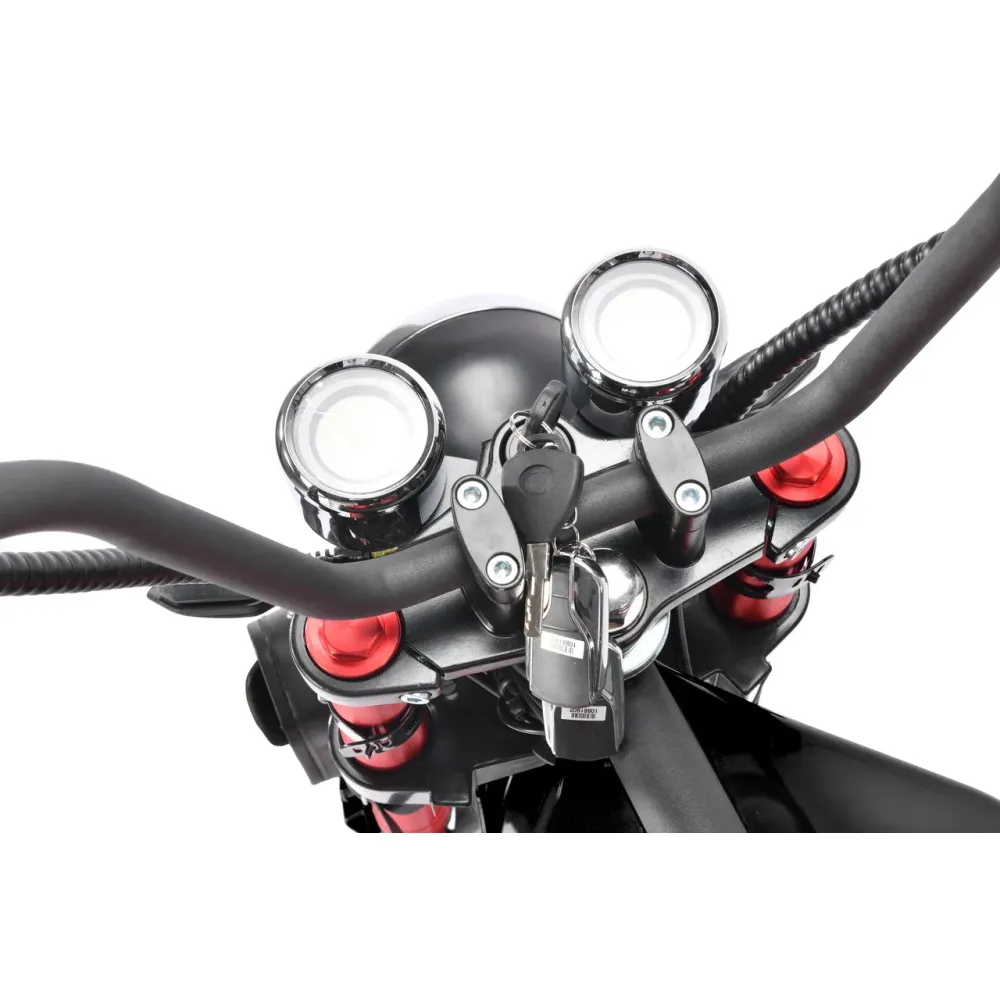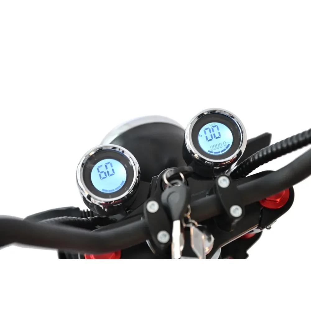 Модель оснащена 12-дюймовыми вездеходными колесами, позволяющими преодолевать препятствия по городской и непроходимой местности. Двигатель мощностью 3950 Вт допускает развитие скорости до 71 км/час. Мощное АКБ с полной зарядкой до 6 часов остается работоспособным до 40 км пути.