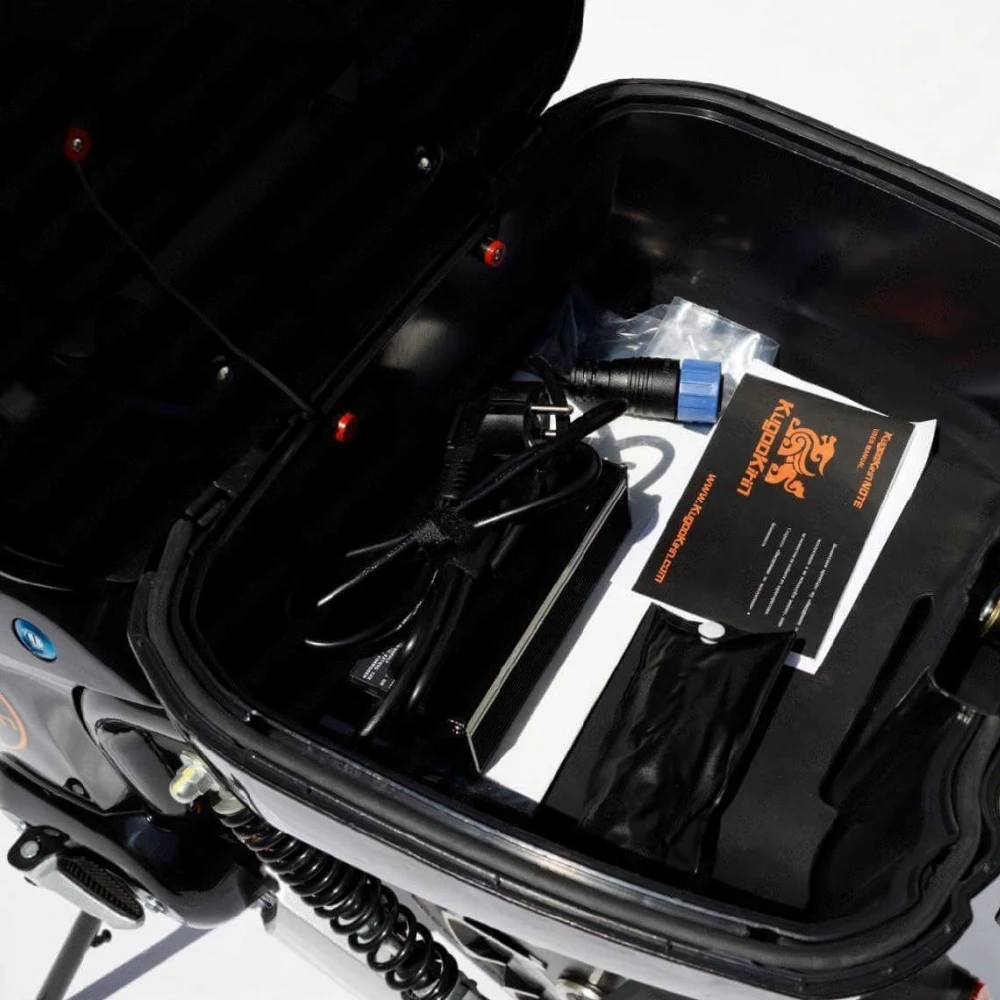 Модель оснащена необходимыми для комфорта и удобства запчастями и аксессуарами. Удобное мягкое седло снижает нагрузку на позвоночник, позволяет забыть об усталости при преодолении больших расстояний. Наличие светодиодной фары, брендовой тормозной системы, зеркал заднего вида обещает активное время провождение на свежем воздухе независимо от погодных условий и суток. Вместительная платформа для ног снижает нагрузку, увеличивает степень комфорта. 16-дюймовая колесная часть накатистая, отлично сцепляемая с поверхностью. Технические характеристики (мощность двигателя – 800 Вт), емкая АКБ (Li-Ion аккумулятор 25Ah, 48V) позволяет развить скорость до 50 км/час и преодолеть на одной подзарядке до 60 км пути.