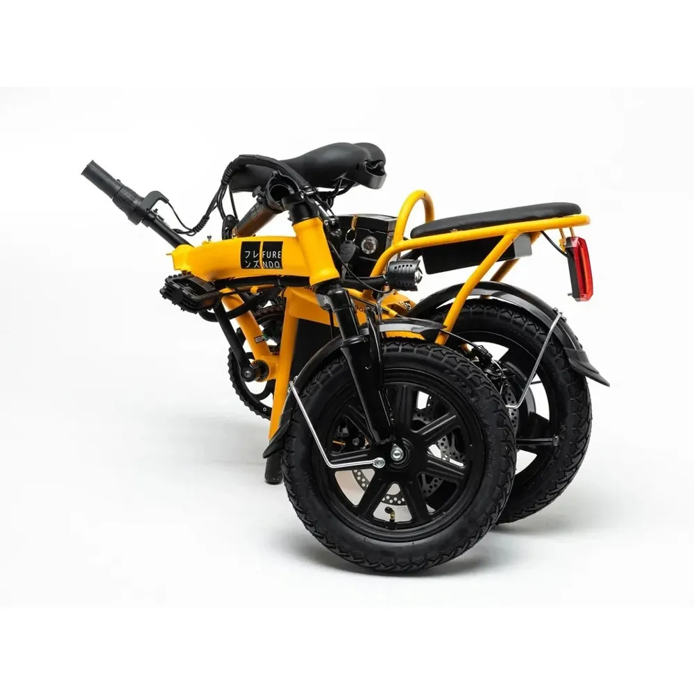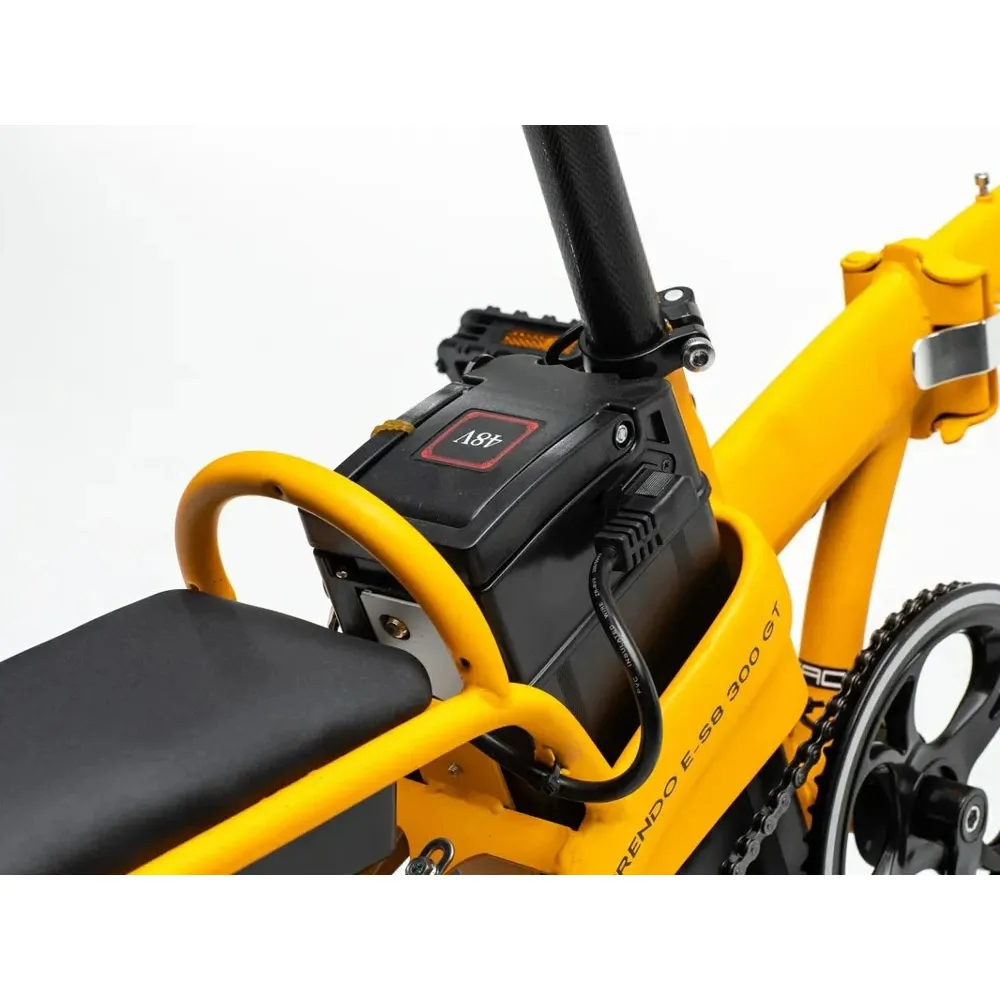 Электровелосипед FURENDO E-S8 300 GT доступен в двух цветовых оттенках: желтый матовый и зеленый матовый. Складное устройство можно хранить в своей квартире после использования, вам даже не нужно занимать парковочное место. Заряжается велосипед прямо из розетки, для этого нужно подождать 7 часов.