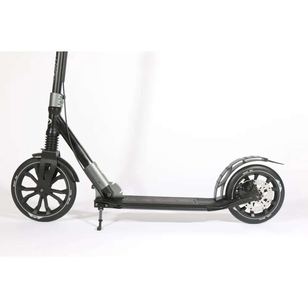 Самокат оснащен передним амортизатором, смягчающим передвижение по каменистой местности. Передняя дисковая и задняя тормозная системы гарантируют своевременное торможение. Самокат оснащен качественными колесами размером 230*30мм. Подшипники - ABEC 9. Обеспечивают отличный накат.