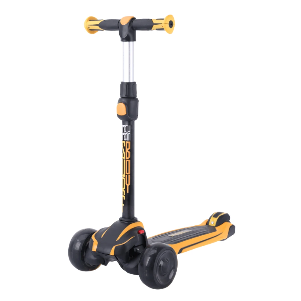 Рукоятка имеет удобные формы и прорезиненную экологически чистую поверхность. Препятствует соскальзыванию ручек. Минимизирует риск неудобств и падения ребенка. Колеса – полиуретановые, большие. Передние и задние представлены размерами 120*50 и 80*50 мм соответственно. Самокат оснащен современными подшипниками и амортизаторами, гарантирует отличный накат, не взывает дискомфорта при пересечении каменистой местности. Во время езды включается светодиодная подсветка, делающая технику более привлекательной.