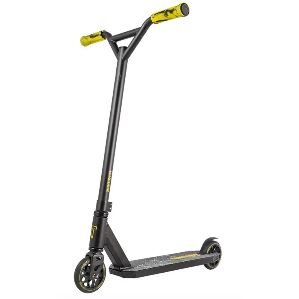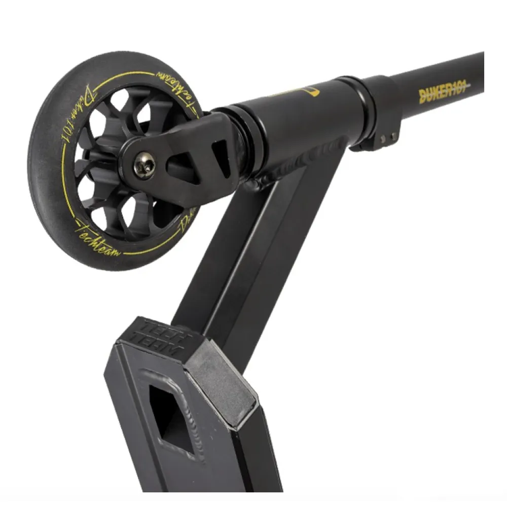 Трюковой самокат Techteam TT DUKER 101 2020 Черный - надежная и качественная модель для начинающих пользователей старше четырех лет. Производители использовали самые качественные материалы, чтобы обеспечить надежность и безопасность транспортного средства. Стальной руль высотой 58 см и шириной 50,5 см имеет надежное крепление системой HIC с зажимом на двух болтах. Стальная вилка также характеризуется высокой прочностью, получив при этом обновленную изящную форму. Полиуретановые колеса на алюминиевых дисках имеют оптимальный диаметр 110 мм и ширину 24 мм. Для данной модели производители предусмотрели качественные подшипники ABEC 9, которые гарантируют хороший накат и комфортный тихий ход. Алюминиевая дека с пластиковыми накладками на боковых гранях отличается высокой прочностью и выдерживает нагрузку до 100 кг. Ее поверхность покрыта мелкозернистой шкуркой, на которой нанесен рисунок с названием самоката. Противоскользящее покрытие позволяет райдеру сохранять устойчивое положение при выполнении различных элементов трюкового катания. Трюковой самокат Techteam TT DUKER 101 2020 сочетает в себе высокое качество материалов и сборки и стильный современный дизайн.